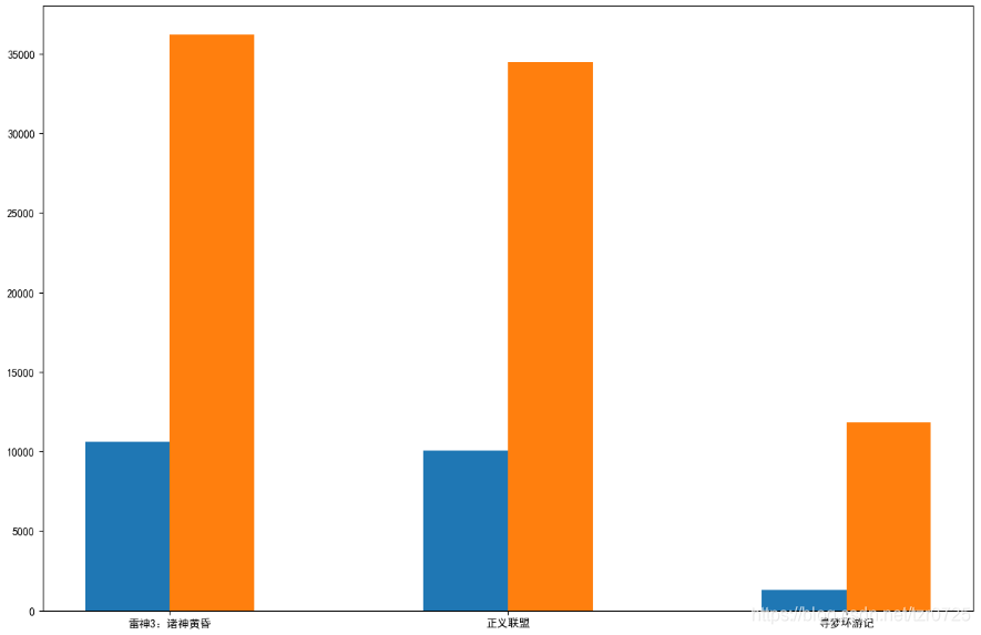 import matplotlib.pyplot as plt # 設置字體 plt.rcParams['font.sans-serif']=['SimHei'] # 替換sans_serif字體 plt.rcParams['axes.unicode_minus']=False # 解決坐標軸負數(shù)的負號顯示問題 plt.figure(figsize=(15,10),dpi=100) # 準備數(shù)據(jù) movie_name = ['雷神3:諸神黃昏','正義聯(lián)盟','尋夢環(huán)游記'] # 構造首日票房,首周票房數(shù)據(jù) first_day = [10587.6,10062.5,1275.7] first_weekend=[36224.9,34479.6,11830] x = range(len(movie_name)) # 繪制第一個柱狀圖 plt.bar(x, first_day, width=0.25) # 接著繪制第二個柱狀圖 plt.bar([i+0.25 for i in x], first_weekend, width=0.25) # 修改刻度名稱 # 顯示x軸中文,固定在首日和首周的中間位置 plt.xticks([i+0.125 for i in x], movie_name) plt.show()