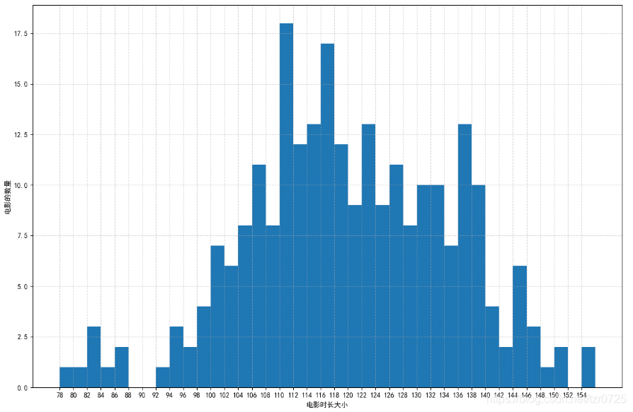 實例:假設我們獲取到了一些電影的時長,繪制直方圖展示電影時長的分布情況,代碼如下:
