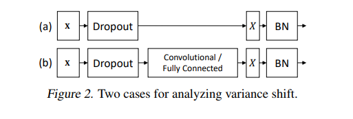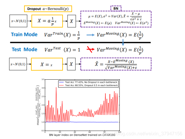 試想若有圖一中的神經(jīng)響應(yīng) X,當(dāng)網(wǎng)絡(luò)從訓(xùn)練轉(zhuǎn)為測(cè)試時(shí),Dropout 可以通過(guò)其隨機(jī)失活保留率(即 p)來(lái)縮放響應(yīng),并在學(xué)習(xí)中改變神經(jīng)元的方差,而 BN 仍然維持 X 的統(tǒng)計(jì)滑動(dòng)方差。