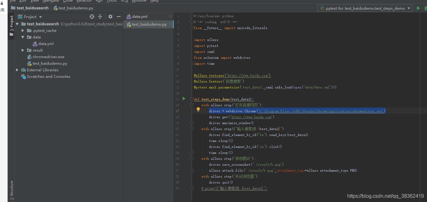 本案例來自于霍格沃茲測試學院《高薪測試成長圖譜》。data.yml為數(shù)據(jù)管理文件,test_baidudemo.py為測試用例文件,文件結(jié)構(gòu)如下: