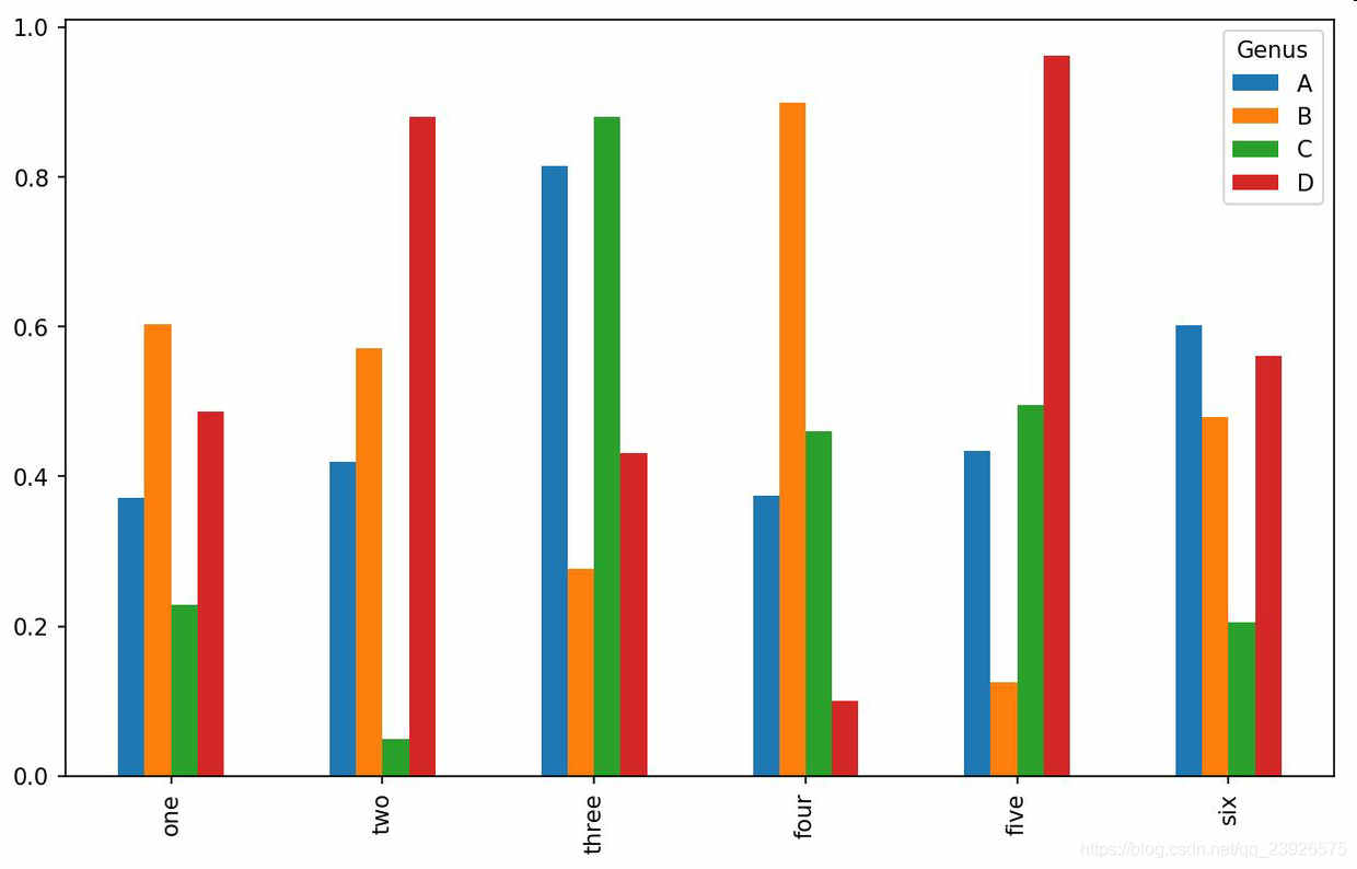 df = pd.DataFrame(np.random.rand(6, 4), index=['one', 'two', 'three', 'four', 'five', 'six'], columns=pd.Index(['A', 'B', 'C', 'D'], name='Genus')) df.plot.bar()