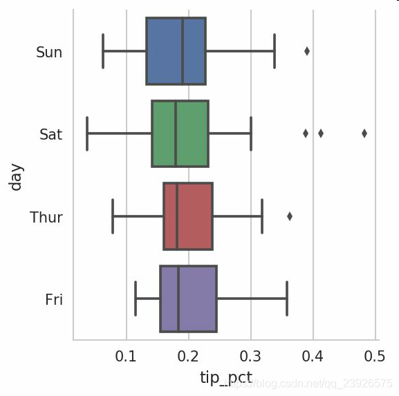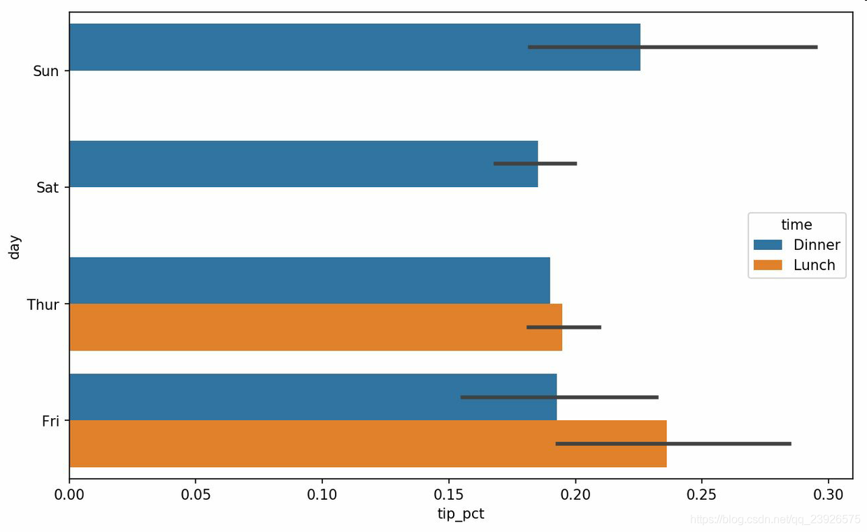 In [83]: import seaborn as sns In [84]: %matplotlib inline # 在jupyter中輸入,避免無法顯示圖的問題 In [85]: tips['tip_pct'] = tips['tip'] / (tips['total_bill'] - tips['tip']) In [86]: tips.head() Out[86]: total_billtip smoker day time sizetip_pct 0 16.99 1.01 No Sun Dinner 2 0.063204 1 10.34 1.66 No Sun Dinner 3 0.191244 2 21.01 3.50 No Sun Dinner 3 0.199886 3 23.68 3.31 No Sun Dinner 2 0.162494 4 24.59 3.61 No Sun Dinner 4 0.172069 In [86]: sns.barplot(x='tip_pct', y='day', data=tips, orient='h') In [87]: sns.barplot(x='tip_pct', y='day', hue='time', data=tips, orient='h') # 根據(jù)time列進行顏色區(qū)分 In [90]: sns.set(style="whitegrid") # 設置圖形外觀