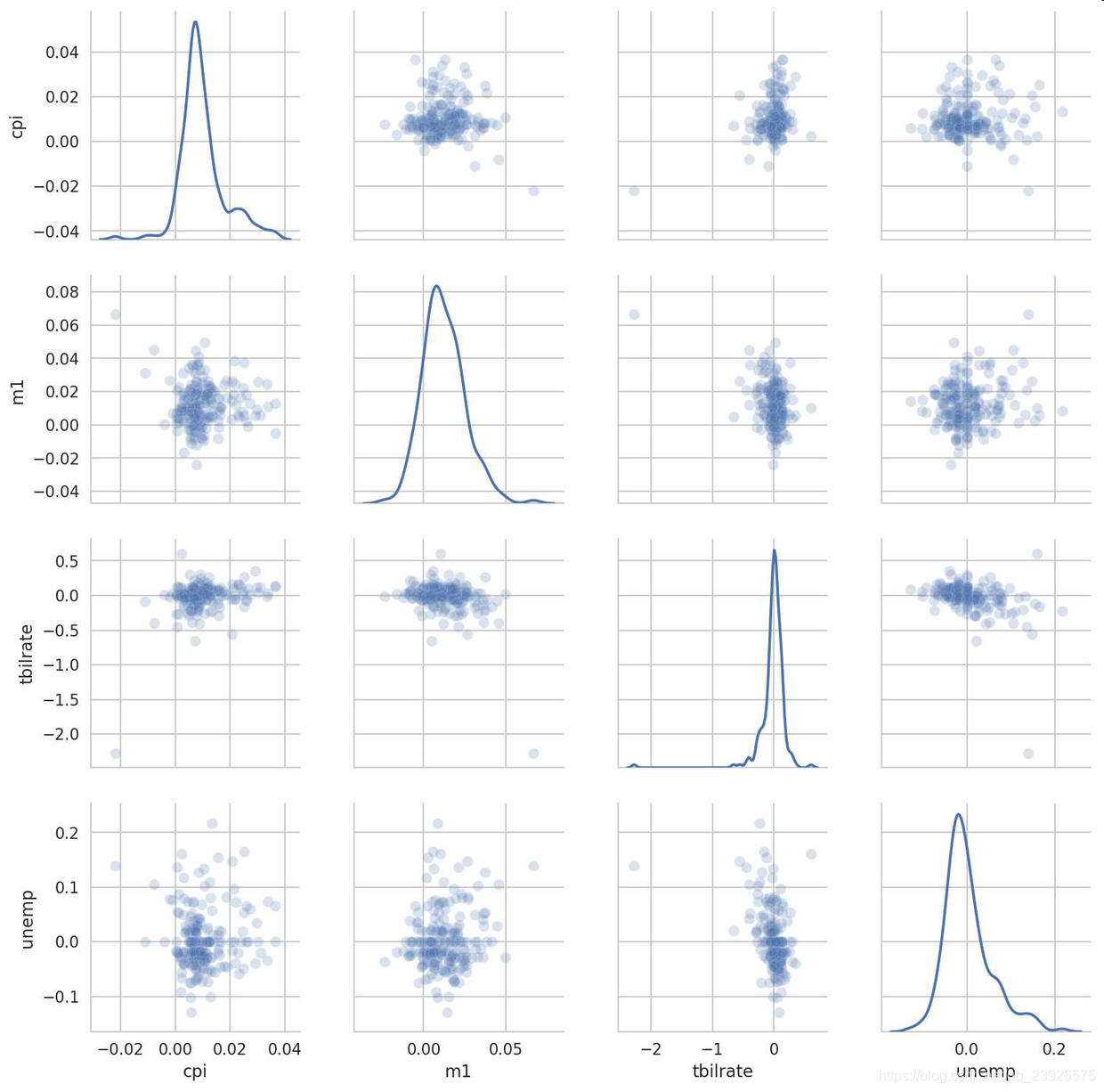 In [107]: sns.pairplot(trans_data, diag_kind='kde', plot_kws={'alpha': 0.2}) # 生成散布圖矩陣,pairplot支持在對角線上放置每個變量的直方圖或密度估計