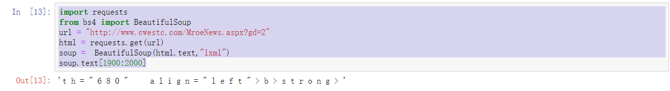 import requests from bs4 import BeautifulSoup url = "http://www.cwestc.com/MroeNews.aspx?gd=1" html = requests.get(url) soup = BeautifulSoup(html.text,"lxml") soup.text[1900:2000]