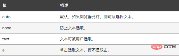 user-select屬性規(guī)定是否能選取元素的文本。在 web 瀏覽器中,如果您在文本上雙擊,文本會(huì)被選取或高亮顯示。此屬性用于阻止這種行為。