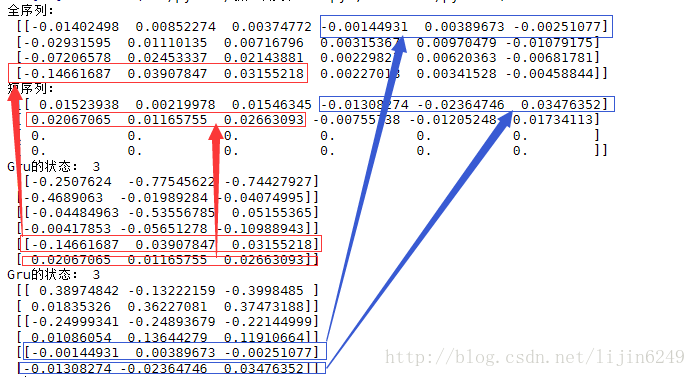 圖中共有4部分輸出,可以看到,第一部分(全序列)就是序列長(zhǎng)度為4的結(jié)果,第二部分(短序列)就是序列長(zhǎng)度為2的結(jié)果。由于沒(méi)一層都是由3個(gè)RNN的GRU cell組成,所以每個(gè)序列的輸出都為3.很顯然,對(duì)于這樣的結(jié)果輸出,必須要將短序列后面的0去掉才可以用。