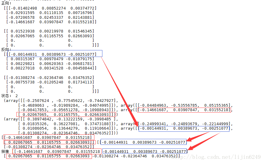 由于單個(gè)GRU本來(lái)就是沒(méi)有狀態(tài)的。所以該函數(shù)將最后的輸出作為狀態(tài)返回。該函數(shù)有兩個(gè)狀態(tài)返回,分別代表前向和后向。每一個(gè)方向的狀態(tài)都會(huì)返回3個(gè)元素。這是因?yàn)槊總€(gè)方向的網(wǎng)絡(luò)都有3層GRU組成。在使用時(shí),一般都會(huì)取最后一個(gè)狀態(tài)。圖中紅色部分為前向中,兩個(gè)樣本對(duì)應(yīng)的輸出,這個(gè)很好理解。