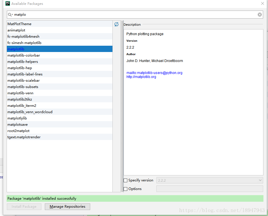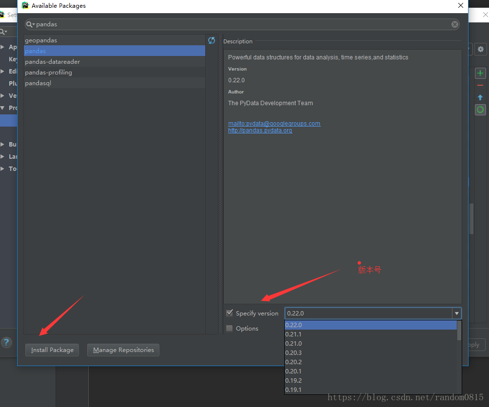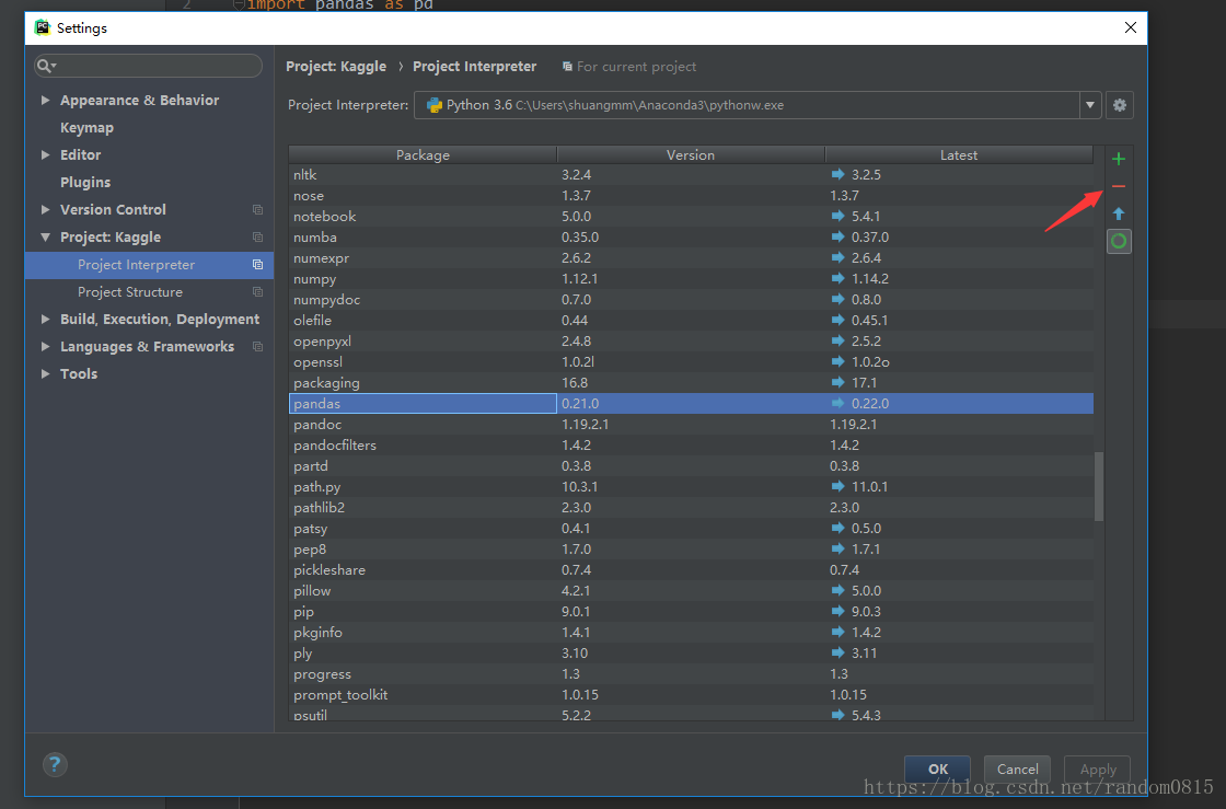 等待成功之后點擊綠色的加號重新安裝,搜索pandas。。注意右下角有版本號,我就是換了兩個版本號之后才安裝好的 然后等待安裝就好了。