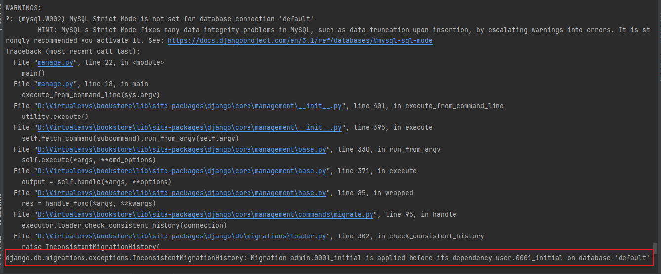 但是執(zhí)行python manage.py migrate提示異常:raise InconsistentMigrationHistory( django.db.migrations.exceptions.InconsistentMigrationHistory: Migration admin.0001_initial is applied before its dependency user.0001_initial on database 'default'