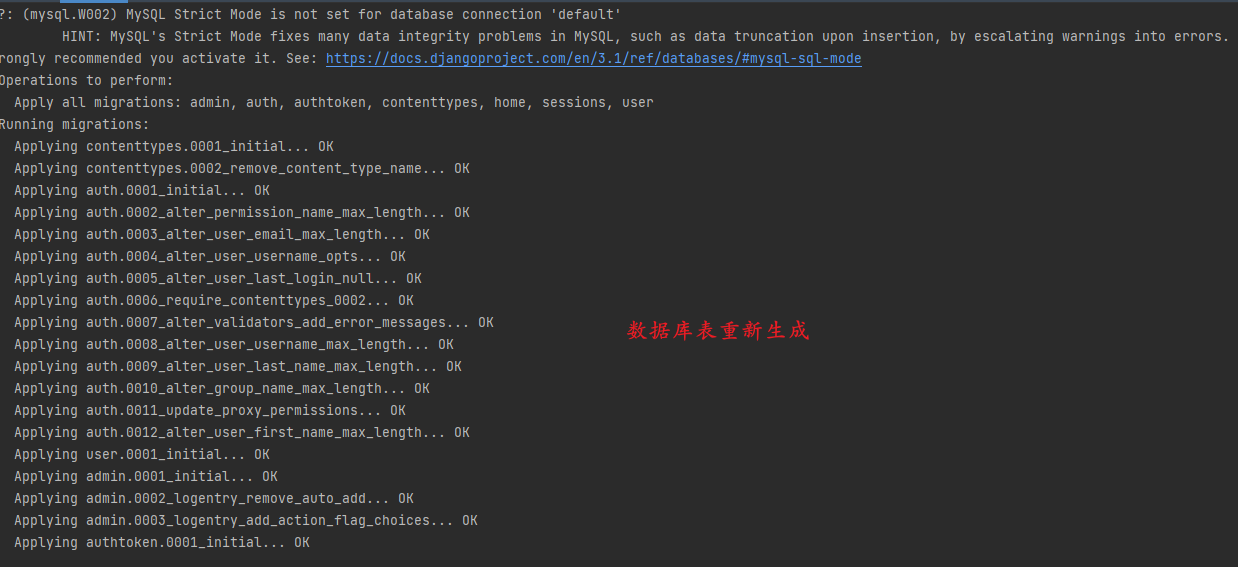 - 刪除數(shù)據(jù)庫(kù)中 除了auth_user的其他表,然后重新執(zhí)行數(shù)據(jù)庫(kù)遷移命令。