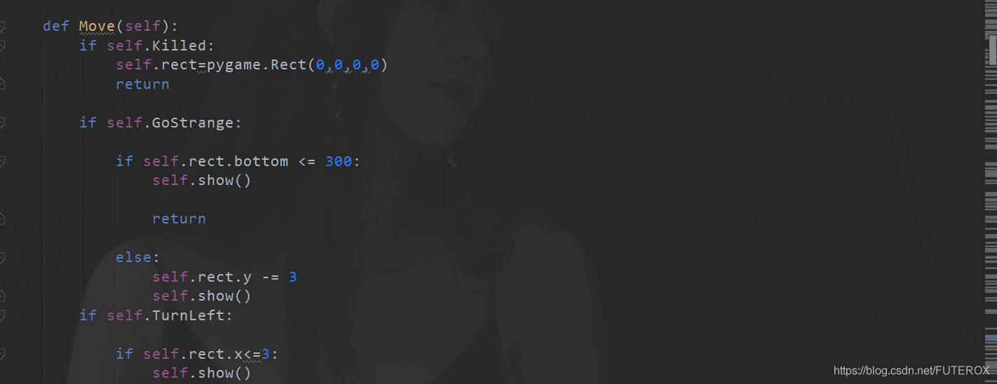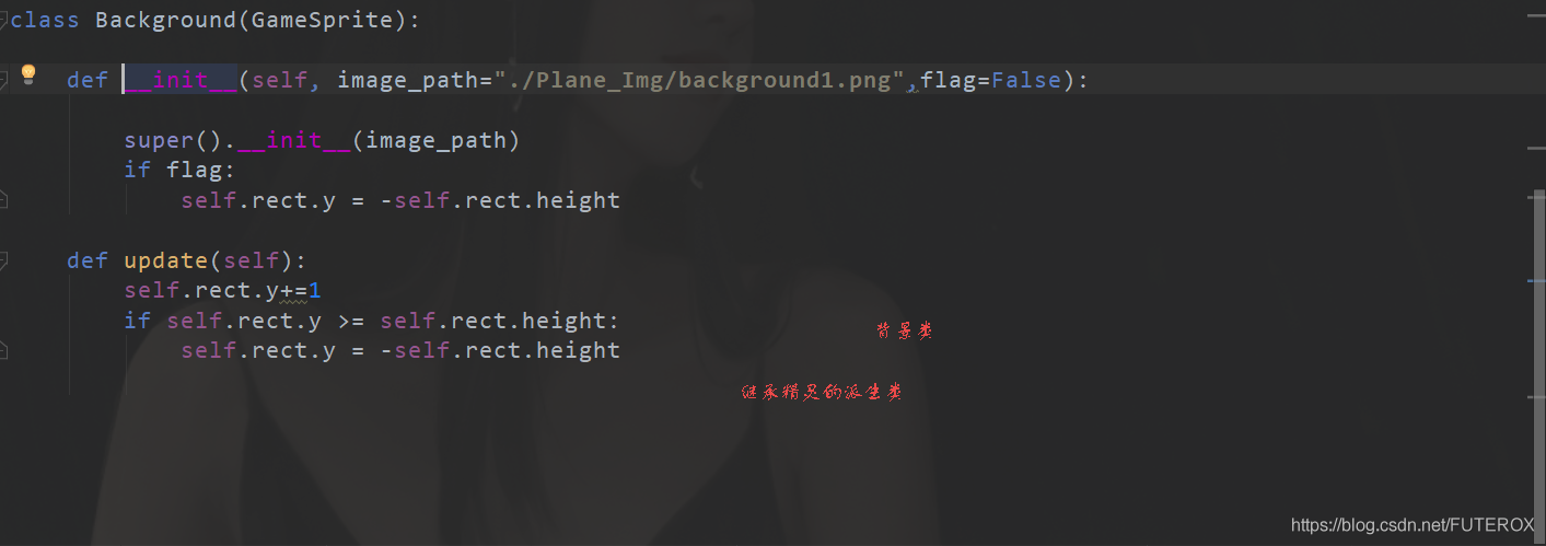 屏幕繪制直接使用pygame.display.set_mode()的bitl()繪制方法,進(jìn)行繪制。當(dāng)然這里的背景是會動的。所以使用到了一個精靈的派生類。