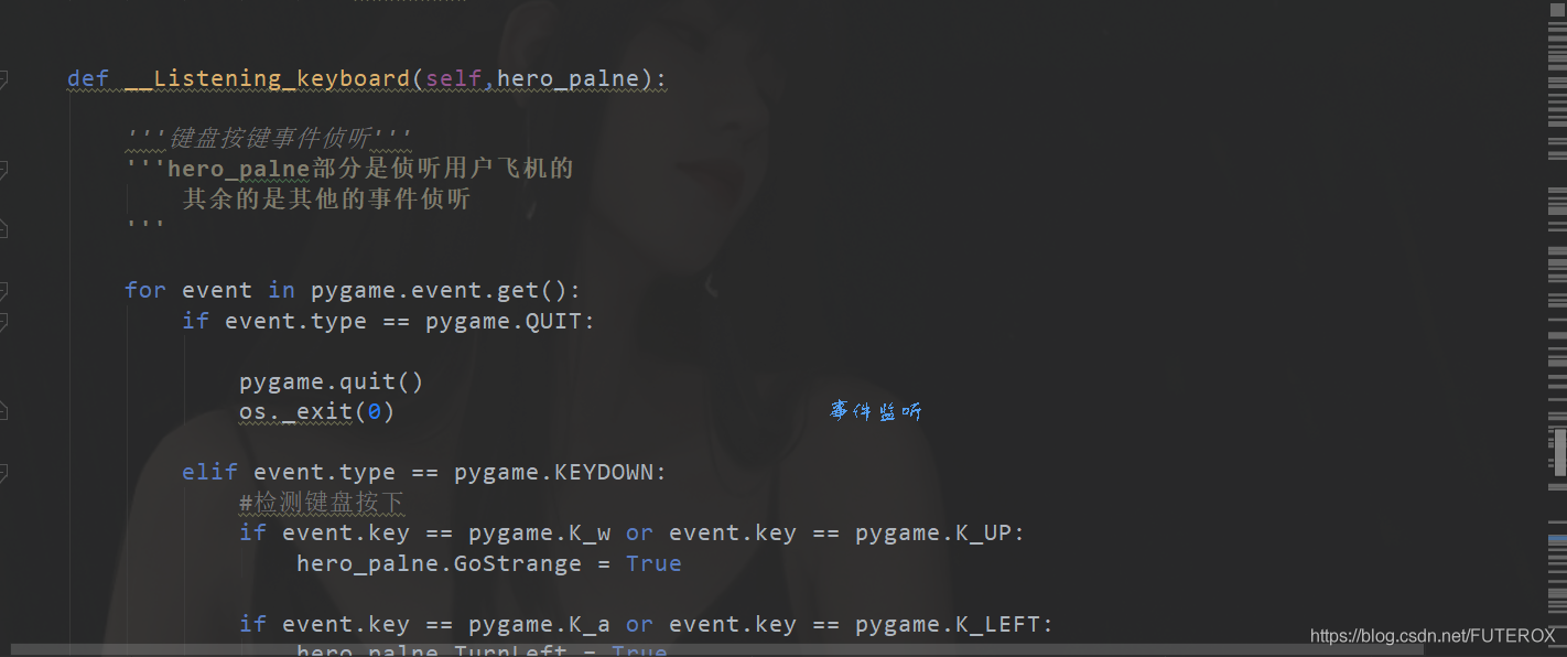 具體思路是用pygame.event.get()進(jìn)行事件檢測。之后檢測到按下某一個按鍵,例如向前移動是,就會設(shè)置向前移動的信號,那么這個時候飛機(jī)就會一直往前走。當(dāng)松開后,那么設(shè)置信號為假,那么飛機(jī)就會停下來。由于飛機(jī)會一直在循環(huán)里面檢測有沒有按下那個向前,所以當(dāng)你長按往前時,飛機(jī)會一直往前,直到你松開。