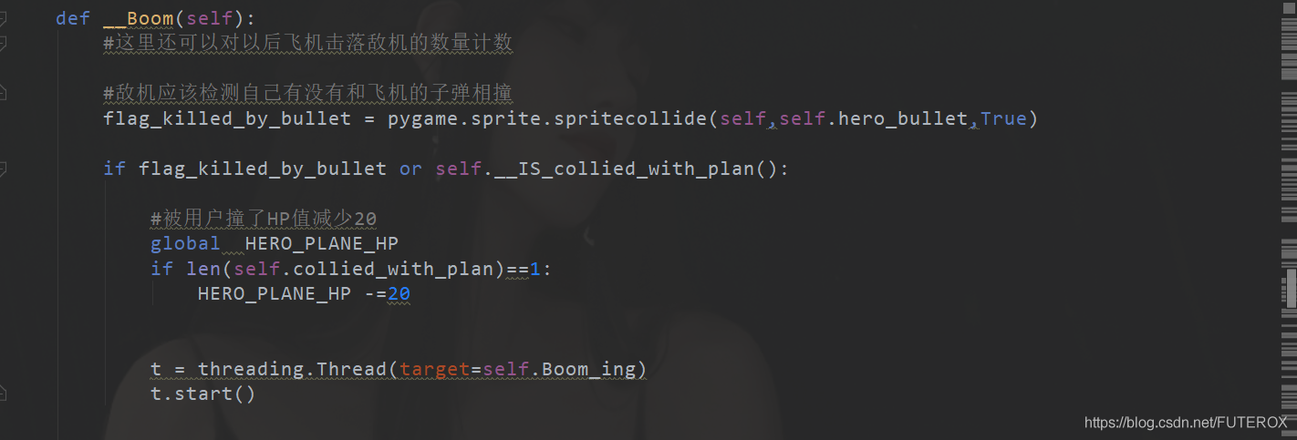 主要是檢測有沒有撞到飛機(jī),之后通過切換圖片就好了。當(dāng)然這個時候我是開了線程的。不然會很快閃過去,換了和沒換一樣你看不到效果。