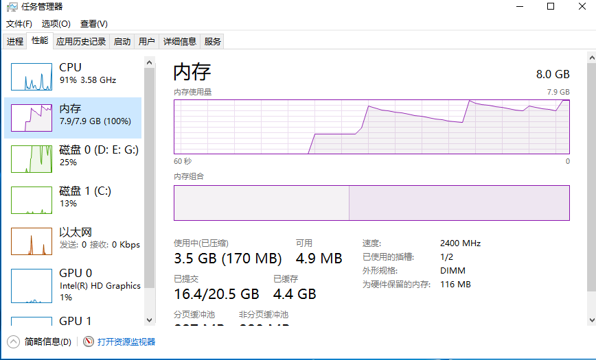 運行的時候可以看下自己電腦的內(nèi)存已經(jīng)占了100%, cpu高達91% ,不掛掉才怪了!