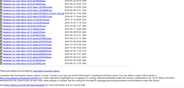 Tesseract的安裝我們可以移步到該網(wǎng)址 https://digi.bib.uni-mannheim.de/tesseract/,我們可以看到如下界面: