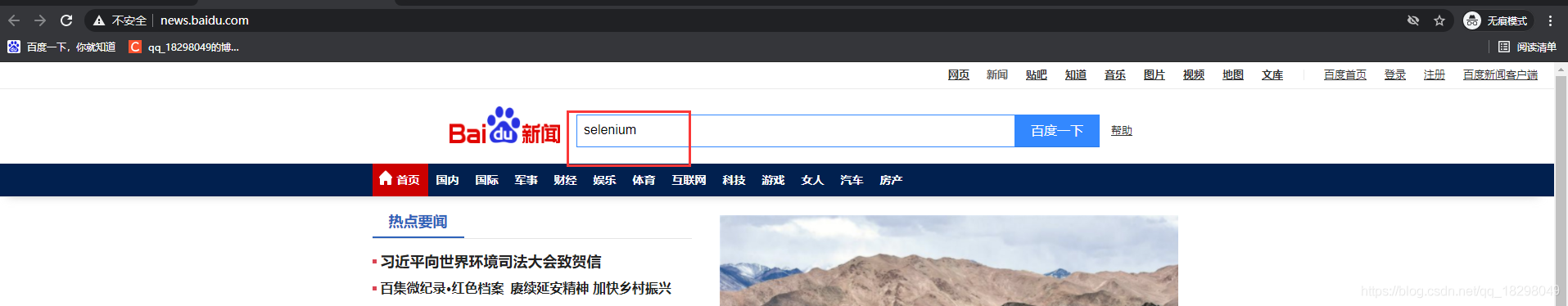 比如我們現(xiàn)在有這樣一個需求,進入百度首頁后,點擊新聞,然后在新聞頁面的搜索框輸入selenium