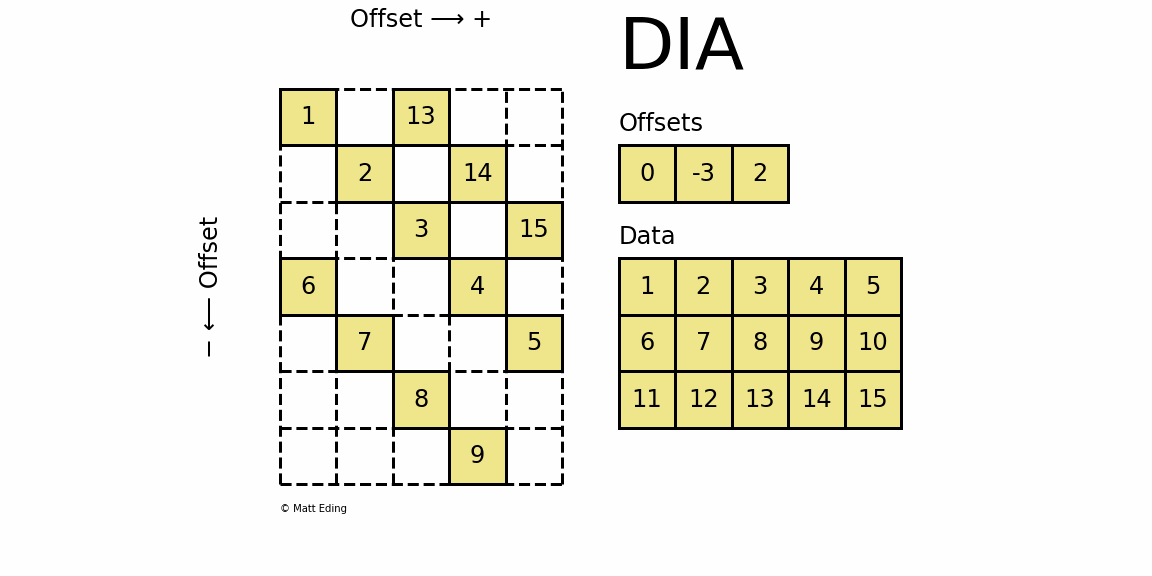 如下圖中,將稀疏矩陣使用offsets和data兩個(gè)矩陣來表示。offsets表示data中每一行數(shù)據(jù)在原始稀疏矩陣中的對(duì)角線位置k(k>0, 對(duì)角線往右上角移動(dòng);k<0, 對(duì)角線往左下方移動(dòng);k=0,主對(duì)角線)。