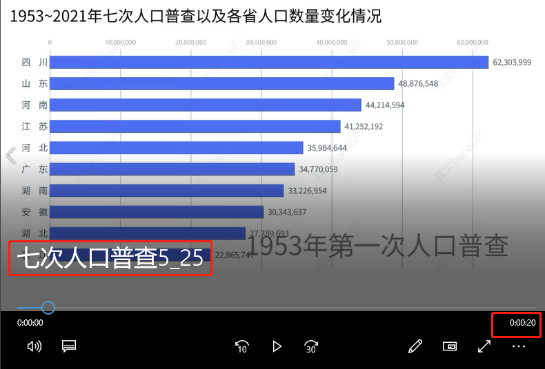 同樣還是以視頻:七次人口普查.mp4為例(視頻一共是38秒),咱們從截取其中的一段(第5s~第25s)20秒。