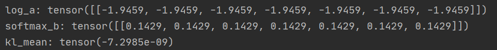 import torch import torch.nn.functional as F a = torch.tensor([[0,0,1.1,2,0,10,0],[0,0,1,2,0,10,0]]) log_a =F.log_softmax(a) b = torch.tensor([[0,0,1.1,2,0,7,0],[0,0,1,2,0,10,0]]) softmax_b =F.softmax(b,dim=-1) kl_mean = F.kl_div(log_a, softmax_b, reduction='mean') print(kl_mean)