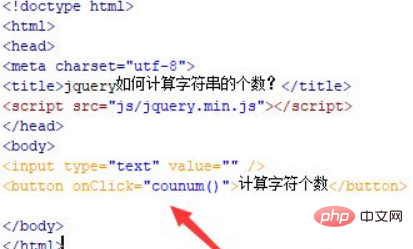 1、新建一個html文件,命名為test.html,用于講解jquery如何計算字符串的個數。使用input標簽創(chuàng)建一個文本框,用于字符串的輸入。使用button標簽創(chuàng)建一個按鈕,按鈕名稱為“計算字符個數”。給button按鈕綁定onclick點擊事件,當按鈕被點擊時,執(zhí)行counum()函數。