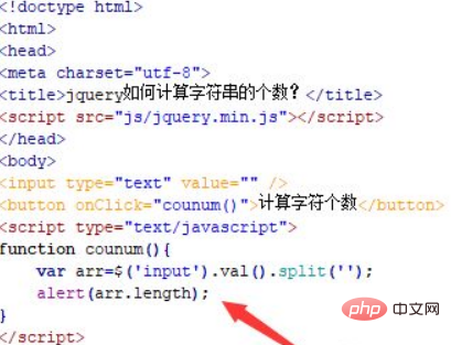3、在js標簽內,創(chuàng)建函數,在函數內,通過input來獲得元素對象,使用val()方法獲得文本框輸入的字符串,再使用split()方法把字符串拆分為數組,通過length屬性便能實現獲得字符串的個數。