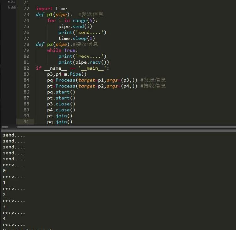 p1.send() #發(fā)送 p2.recv() #接收 p1.close() #關(guān)閉連接 p1.fileno() #返回連接使用的整數(shù)文件描述符 p1.poll([timeout]) #如果連接上的數(shù)據(jù)可用,返回True,timeout指定等待的最長(zhǎng)時(shí)限。 p2.recv_bytes([maxlength]) #接收最大字節(jié)數(shù) p1.send_bytes([maxlength]) #發(fā)送最大字節(jié)數(shù) #接收一條完整的字節(jié)消息,并把它保存在buffer對(duì)象中,offset指定緩沖區(qū)中放置消息處的字節(jié)位移. p2.recv_bytes_into(buffer [, offset])