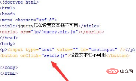 2、在js標簽中,創(chuàng)建setdis()函數(shù),在函數(shù)內(nèi),使用$符號通過id(testinput)獲得input對象,使用prop()方法設置input的disabled屬性為disabled,從而實現(xiàn)文本框不可用。