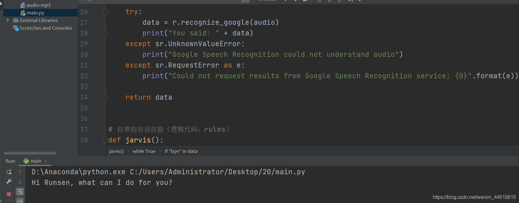 上面,我們實(shí)現(xiàn)了用麥克風(fēng)記錄下你的話,并且得到了對(duì)應(yīng)的文本,那么下一步就是字符串的文本操作了,比如說(shuō)how are you,那回答"I am fine”,然后將"I am fine”通過(guò)gtts是將文字轉(zhuǎn)化為語(yǔ)音