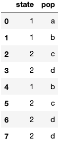 data={'state':[1,1,2,2,1,2,2,2],'pop':['a','b','c','d','b','c','d','d']}