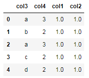 import numpy as np import pandas as pd #生成重復(fù)數(shù)據(jù) df=pd.DataFrame(np.ones([5,2]),columns=['col1','col2']) df['col3']=['a','b','a','c','d'] df['col4']=[3,2,3,2,2] df=df.reindex(columns=['col3','col4','col1','col2']) #將新增的一列排在第一列 df