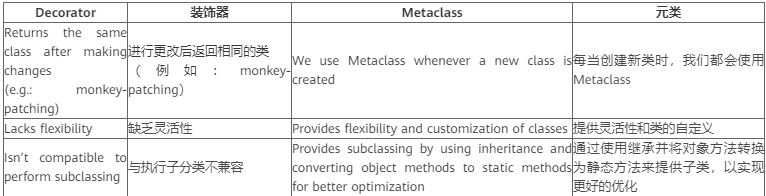 元類允許自定義類。還有多種其他有效且簡(jiǎn)單得多的方法可以通過(guò)這些方法實(shí)現(xiàn)相同的輸出。這樣的例子之一就是使用裝飾器。