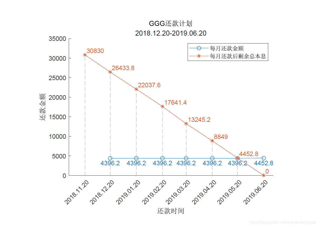 legend([p(1) p(2)],{'每月還款金額','每月還款后剩余總本息'},...
