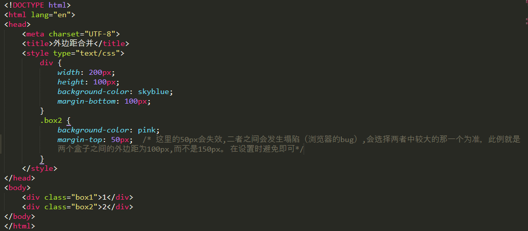 對于兩個嵌套關(guān)系的元素,如果父元素中沒有內(nèi)容或者內(nèi)容在子元素的后面并且沒有上內(nèi)邊距及邊框,則父元素的上邊距會與子元素的上外邊距發(fā)生合并,且值為最大的那個上外邊距,同時該值作為父元素的上外邊距。即使父元素的上外邊距為0,也會發(fā)生合并。(只有垂直方向才會發(fā)生塌陷)
