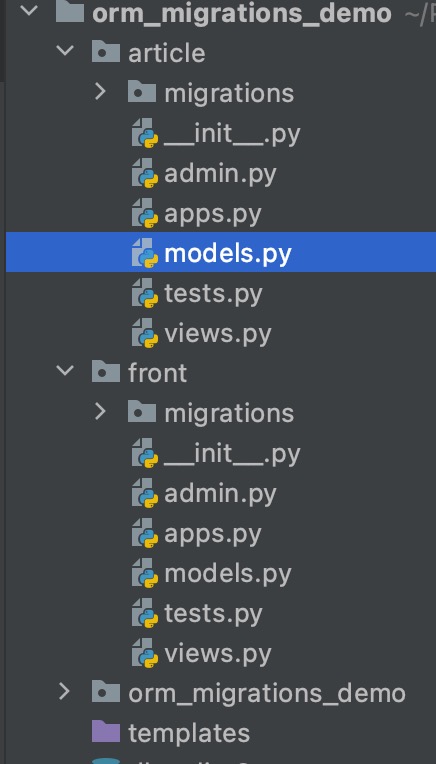 首先我們創(chuàng)建一個項目orm_migrations_demo,接著創(chuàng)建2個app應用front和article,代碼結(jié)構(gòu)如下圖