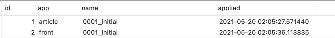 接著我們執(zhí)行migrate article,再輸入migrate front,migrate發(fā)現(xiàn)數(shù)據(jù)庫中沒有遷移腳本,那么就會執(zhí)行剛才生成的2個遷移腳本,將遷移腳本翻譯成SQL語句,然后創(chuàng)建了2張表,執(zhí)行完成后,會將遷移腳本記錄到django_migrations表中,數(shù)據(jù)庫中表結(jié)構(gòu)如下: