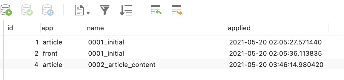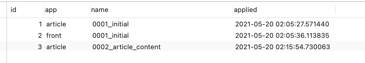 然后執(zhí)行命令makemigrations article,會在項目中生成遷移文件0002_article_content.py,接著執(zhí)行migrate article,執(zhí)行遷移腳本,此時數(shù)據(jù)庫中表django_migrations有3個遷移腳本