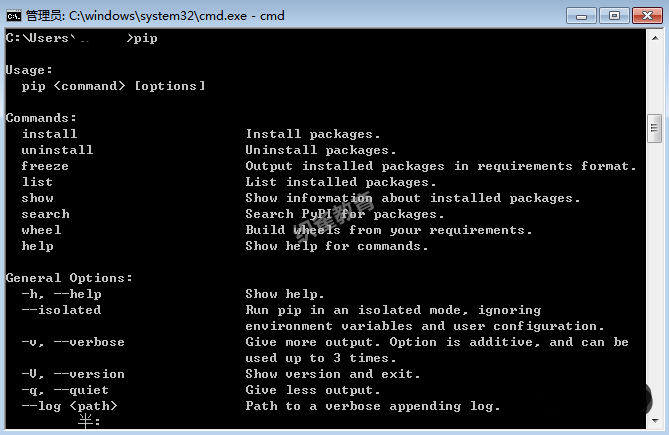 3.然后在打開(kāi)的窗口輸入pip(或pip.exe)試試吧