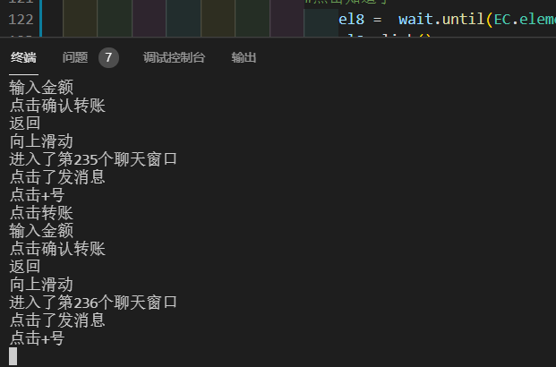 if is_jia == True:el4 = wait.until(EC.element_to_be_clickable((By.ID, "com.tencent.mm:id/ay7")))el4.click()print('點擊+號')#判斷是否為轉(zhuǎn)賬is_zhuanzhang = wait.until(EC.element_to_be_clickable((By.XPATH,"http://android.widget.FrameLayout/android.widget.LinearLayout/android.widget.FrameLayout/android.view.ViewGroup/android.widget.FrameLayout[1]/android.widget.LinearLayout/android.widget.FrameLayout/android.widget.LinearLayout/android.widget.FrameLayout/android.widget.LinearLayout/android.widget.FrameLayout[2]/android.widget.RelativeLayout/android.widget.LinearLayout/android.widget.FrameLayout/android.widget.LinearLayout/android.widget.LinearLayout/android.widget.LinearLayout/android.view.ViewGroup/android.widget.GridView/android.widget.LinearLayout[6]/android.widget.FrameLayout/android.widget.LinearLayout/android.widget.TextView")))if is_zhuanzhang.text == "轉(zhuǎn)賬":# is_zhuanzhang = is_element_exist(driver, 'xpath', '//android.widget.FrameLayout/android.widget.LinearLayout/android.widget.FrameLayout/android.view.ViewGroup/android.widget.FrameLayout[1]/android.widget.LinearLayout/android.widget.FrameLayout/android.widget.LinearLayout/android.widget.FrameLayout/android.widget.LinearLayout/android.widget.FrameLayout[2]/android.widget.RelativeLayout/android.widget.LinearLayout/android.widget.FrameLayout/android.widget.LinearLayout/android.widget.LinearLayout/android.widget.LinearLayout/android.view.ViewGroup/android.widget.GridView/android.widget.LinearLayout[6]/android.widget.FrameLayout/android.widget.LinearLayout/android.widget.TextView')# if is_zhuanzhang == True: