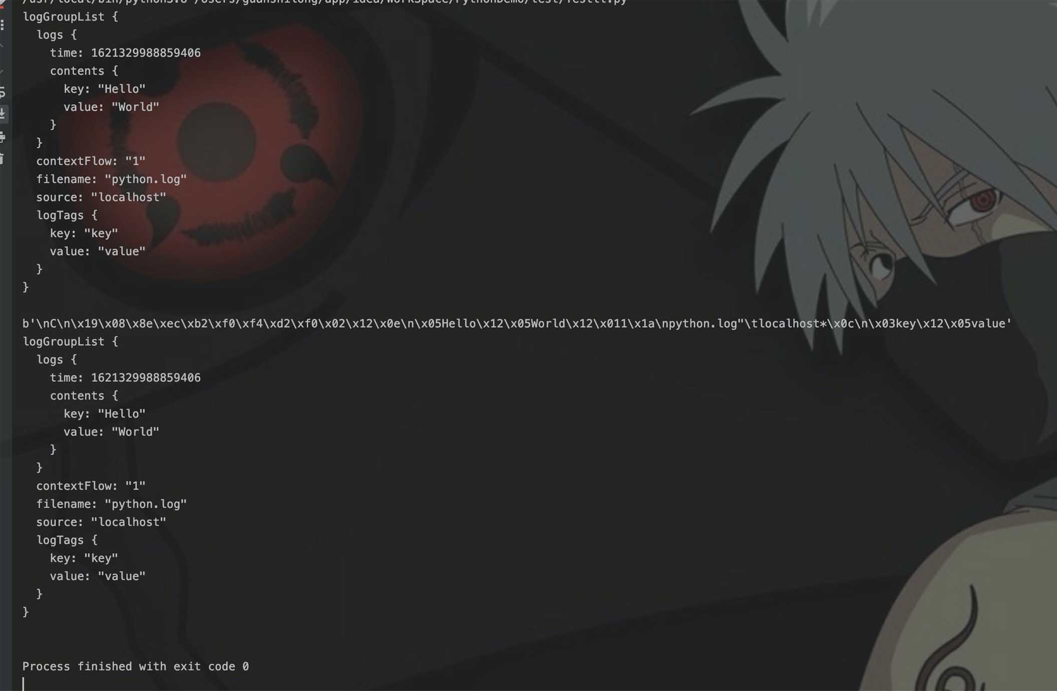 import cls_pb2 as cls import time # 構(gòu)建protoBuf日志內(nèi)容 LogLogGroupList = cls.LogGroupList() LogGroup = LogLogGroupList.logGroupList.add() LogGroup.contextFlow = "1" LogGroup.filename = "python.log" LogGroup.source = "localhost" LogTag = LogGroup.logTags.add() LogTag.key = "key" LogTag.value = "value" Log = LogGroup.logs.add() Log.time = int(round(time.time() * 1000000)) Content = Log.contents.add() Content.key = "Hello" Content.value = "World" print(LogLogGroupList) # 序列化 data = LogLogGroupList.SerializeToString() print(data)