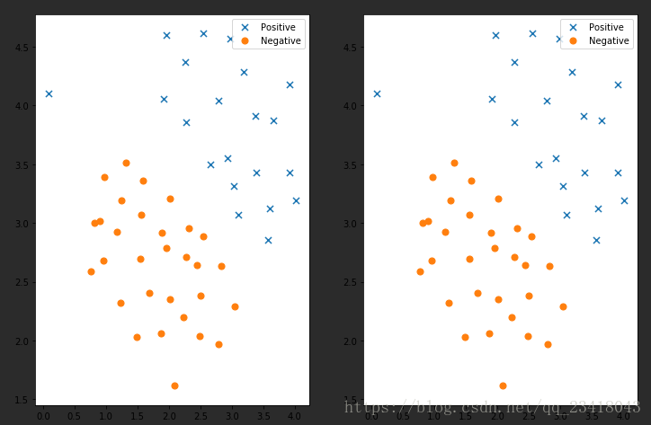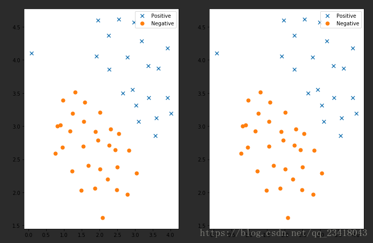 ax1 = plt.subplot(1,2,1) ax1.scatter(positive['X1'], positive['X2'], s=50, marker='x', label='Positive') ax1.scatter(negative['X1'], negative['X2'], s=50, marker='o', label='Negative') ax1.legend()#添加圖列就是右上角的點(diǎn)說(shuō)明 ax2 = plt.subplot(1,2,2) ax2.scatter(positive['X1'], positive['X2'], s=50, marker='x', label='Positive') ax2.scatter(negative['X1'], negative['X2'], s=50, marker='o', label='Negative') ax2.legend()#添加圖列就是右上角的點(diǎn)說(shuō)明