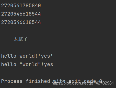 name = 'xiaohua' x=id(name) print(x) name='xiaoming' y=id(name) print(y) new_name=name print(id(new_name)) info=''' 太膩了 ''' print(info) info1="ni" info2='ni' new_str= "hello world!'yes'" print(new_str) new_str1= 'hello "world"!yes' print(new_str1)
