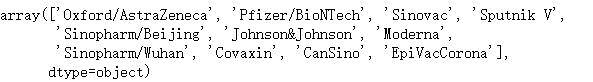 vaccines_by_country.vaccines.unique() # 查看疫苗的種類