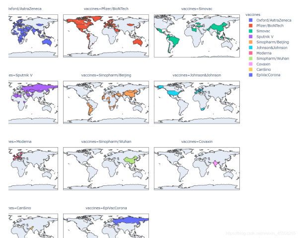 #繪圖 fig=px.choropleth(vaccines_by_country, locations='Country', locationmode='country names', color='vaccines', facet_col='vaccines', facet_col_wrap=3) fig.update_layout(width=1200, height=1000) fig.show()
