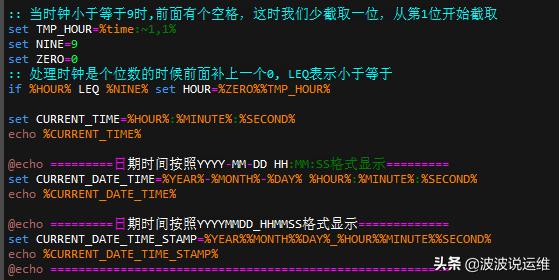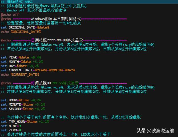 :: 編碼格式 ANSI:: 腳本創(chuàng)建時最好選擇ANSI編碼(防止中文亂碼):: @echo off 表示不回顯執(zhí)行的命令@echo off @echo =========Windows的原本日期時間格式=======================:: 設(shè)置變量,使用變量時需要用一對%包起來set ORIGINAL_DATE=%date% echo %ORIGINAL_DATE% @echo =========日期按照YYYY-MM-DD格式顯示======================:: 日期截取遵從格式 %date:~x,y%,表示從第x位開始,截取y個長度(x,y的起始值為0):: 年份從第0位開始截取4位,月份從第5位開始截取2位,日期從第8位開始截取2位 set YEAR=%date:~0,4%set MONTH=%date:~5,2%set DAY=%date:~8,2%set CURRENT_DATE=%YEAR%-%MONTH%-%DAY%echo %CURRENT_DATE% @echo =========時間按照HH:MM:SS格式顯示========================:: 時間截取遵從格式 %time:~x,y%,表示從第x位開始,截取y個長度(x,y的起始值為0):: 時鐘從第0位開始截取2位,分鐘從第3位開始截取2位,秒鐘從第6位開始截取2位 set HOUR=%time:~0,2%set MINUTE=%time:~3,2%set SECOND=%time:~6,2% :: 當(dāng)時鐘小于等于9時,前面有個空格,這時我們少截取一位,從第1位開始截取set TMP_HOUR=%time:~1,1%set NINE=9set ZERO=0:: 處理時鐘是個位數(shù)的時候前面補(bǔ)上一個0, LEQ表示小于等于if %HOUR% LEQ %NINE% set HOUR=%ZERO%%TMP_HOUR% set CURRENT_TIME=%HOUR%:%MINUTE%:%SECOND%echo %CURRENT_TIME% @echo =========日期時間按照YYYY-MM-DD HH:MM:SS格式顯示=========set CURRENT_DATE_TIME=%YEAR%-%MONTH%-%DAY% %HOUR%:%MINUTE%:%SECOND%echo %CURRENT_DATE_TIME% @echo =========日期時間按照YYYYMMDD_HHMMSS格式顯示=============set CURRENT_DATE_TIME_STAMP=%YEAR%%MONTH%%DAY%_%HOUR%%MINUTE%%SECOND%echo %CURRENT_DATE_TIME_STAMP%@echo =========================================================pause