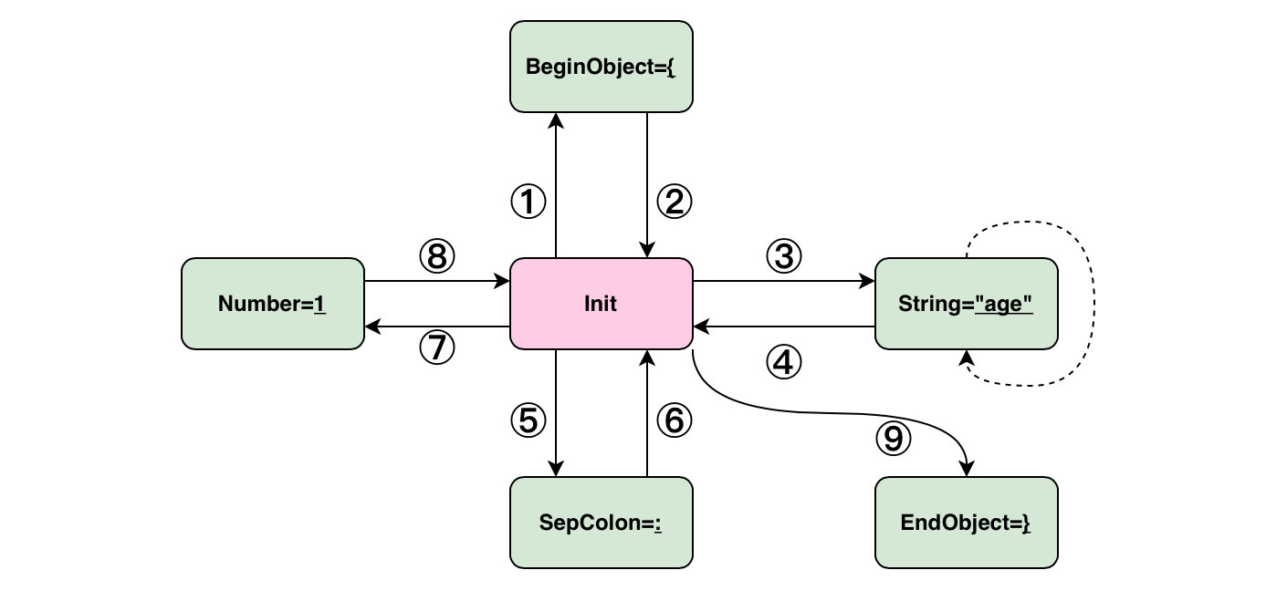 以這段JSON為例:{"age":1},它的狀態(tài)扭轉(zhuǎn)如下圖: