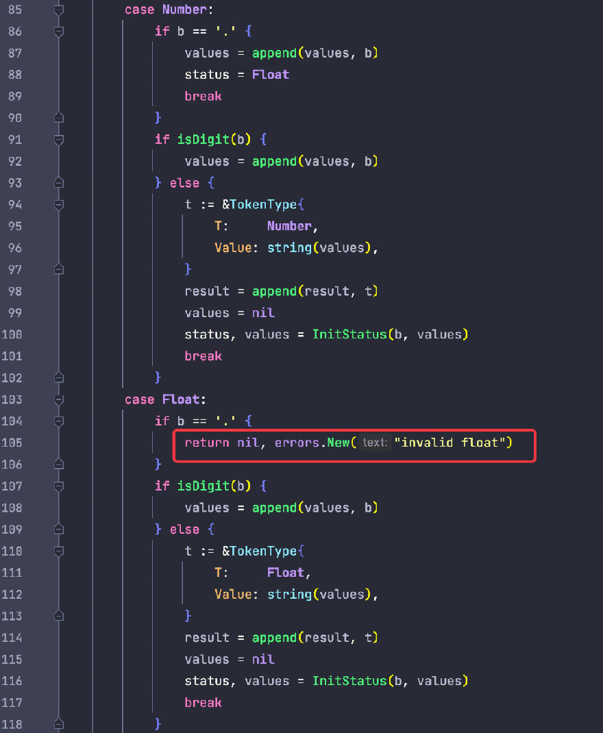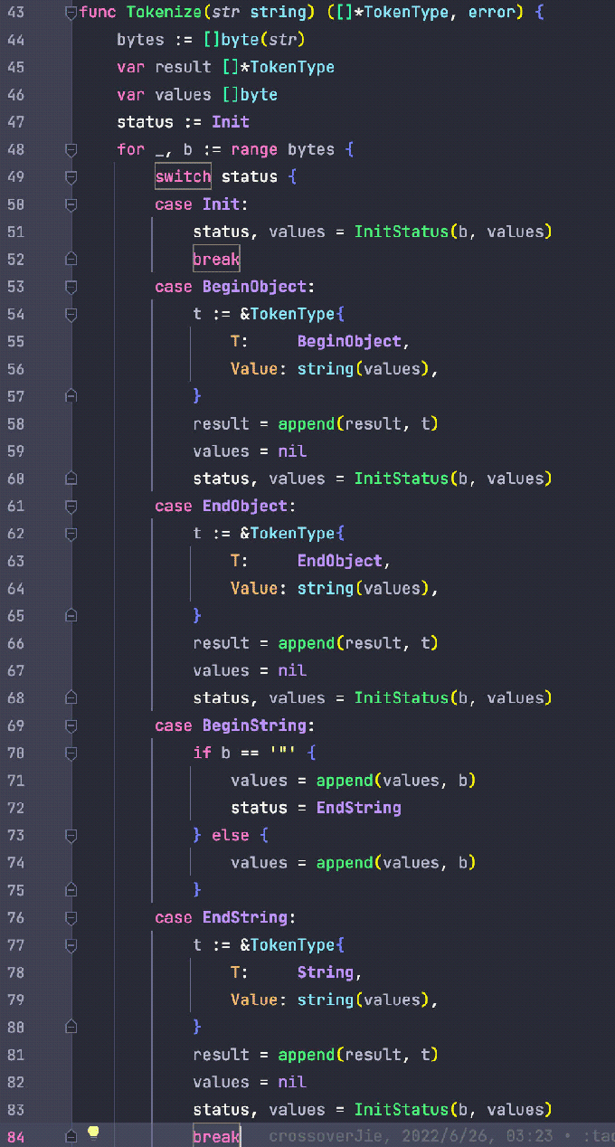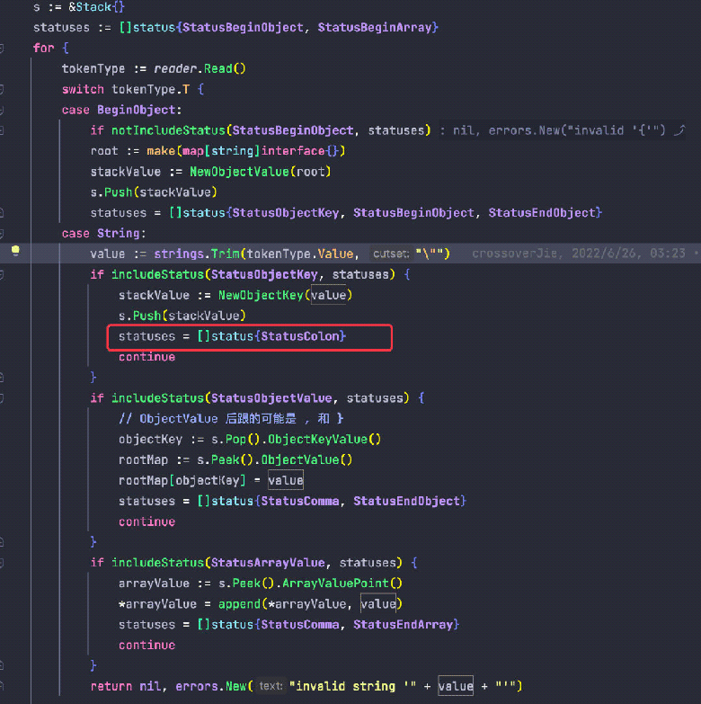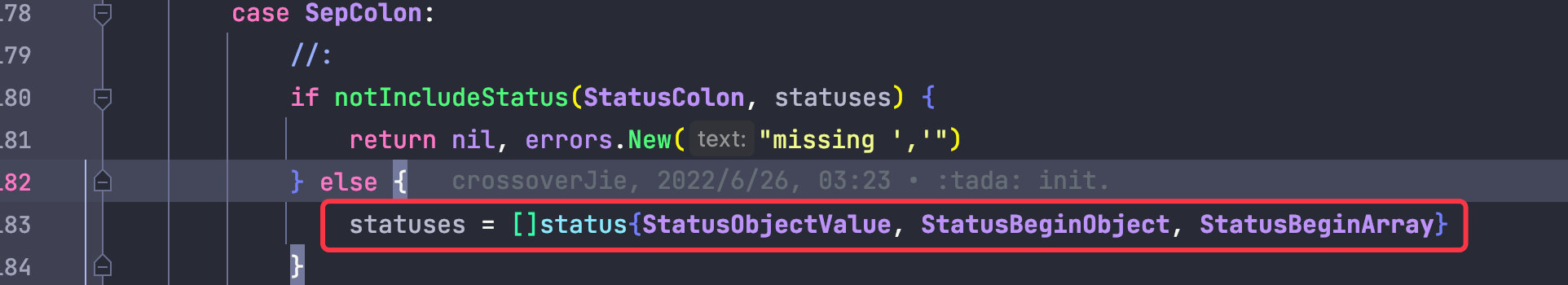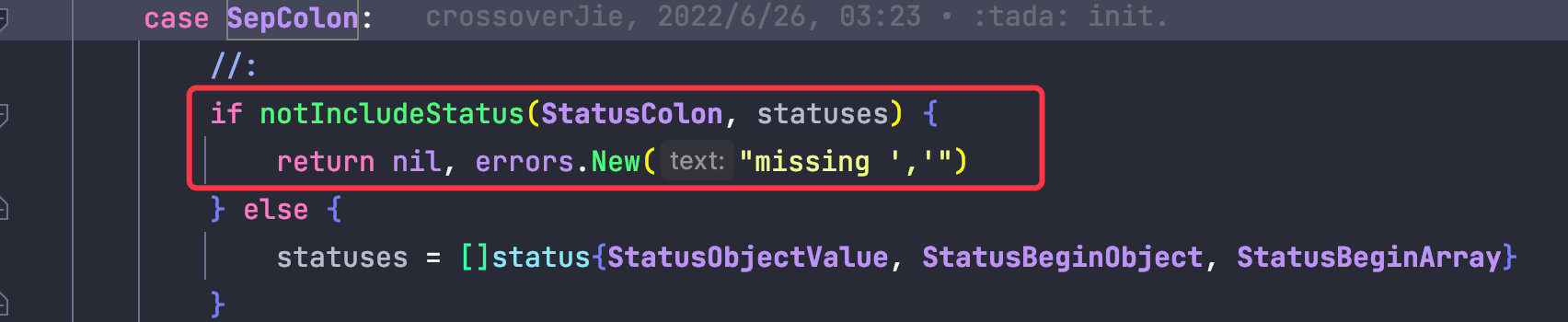 所以我們得將當(dāng)前的 status 記錄為StatusColon,一旦后續(xù)解析到 token 為SepColon時,就需要判斷當(dāng)前的 status 是否為StatusColon,如果不是則說明語法錯誤,就可以拋出異常。