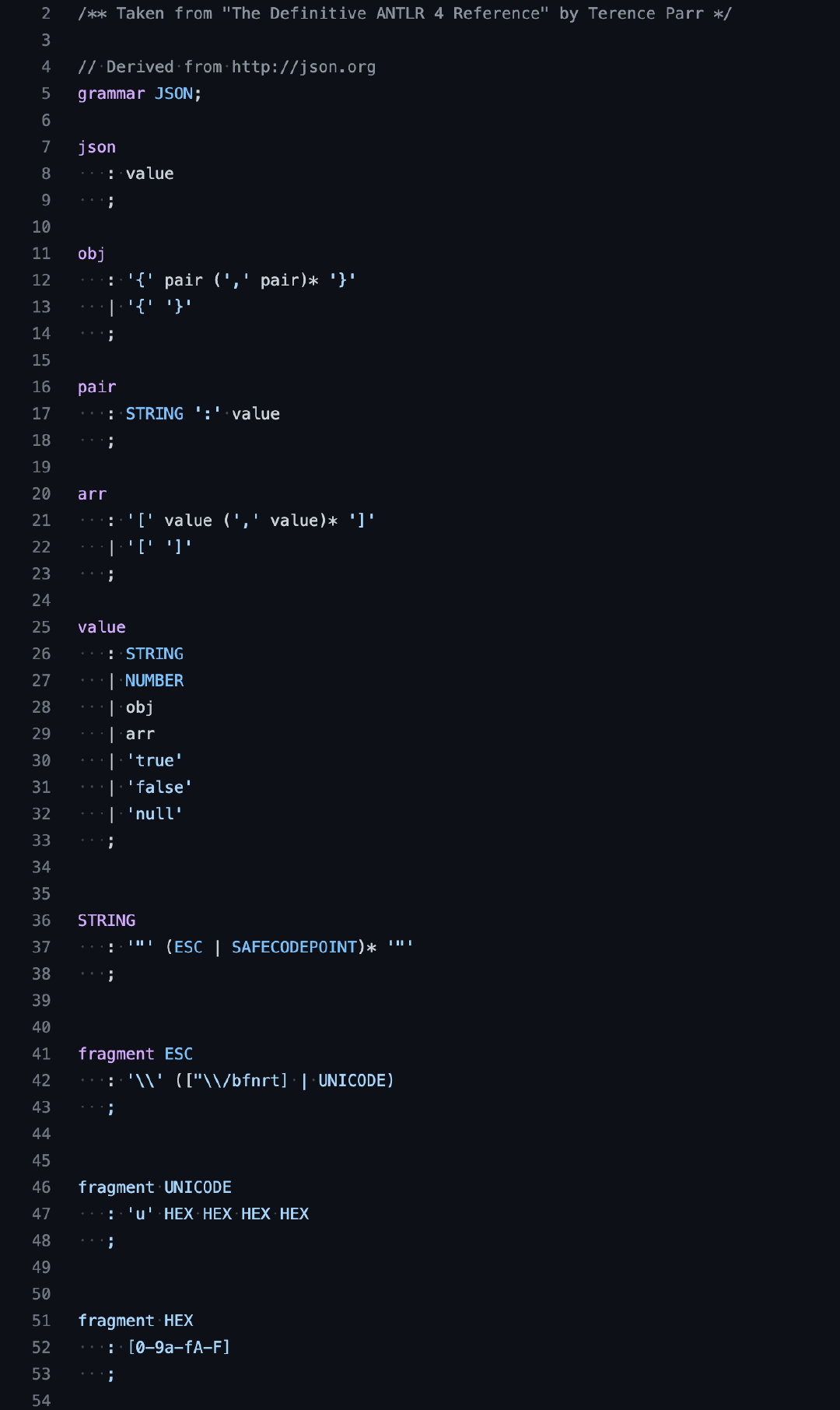 https://github.com/antlr/grammars-v4/blob/master/json/JSON.g4