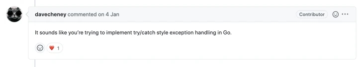 社區(qū)在交流時(shí),也發(fā)現(xiàn)了用戶在現(xiàn)有機(jī)制下可以自主實(shí)現(xiàn) Go 的類 try-catch 的模式。