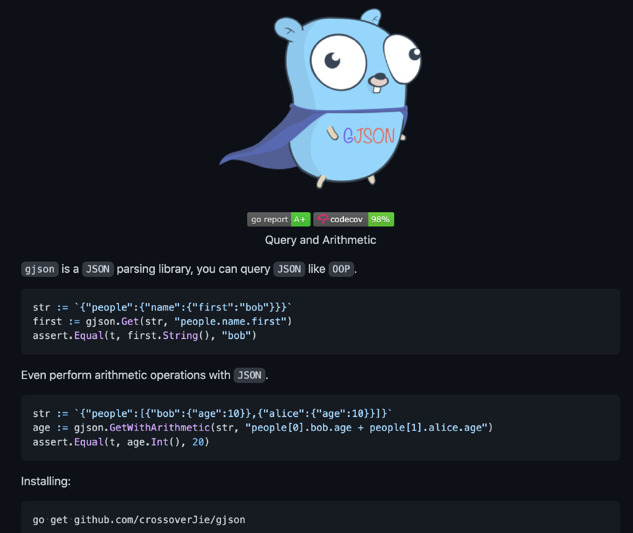 assert.Equal(t, xjson.Get(str,"skill.lang[0].go.feature[3]").Bool(), true)這樣的語法使用個人覺得還是滿符合直覺的,相信對使用者來說也比較簡單。