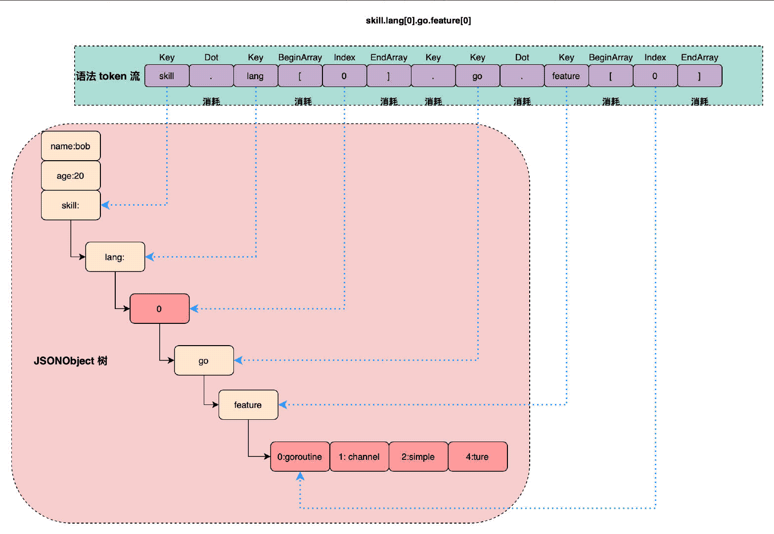 其中每當(dāng)遇到.[]這樣的 token 時便消耗掉,直到我們將 token 遍歷完畢,這時將當(dāng)前JSONObject返回即可。